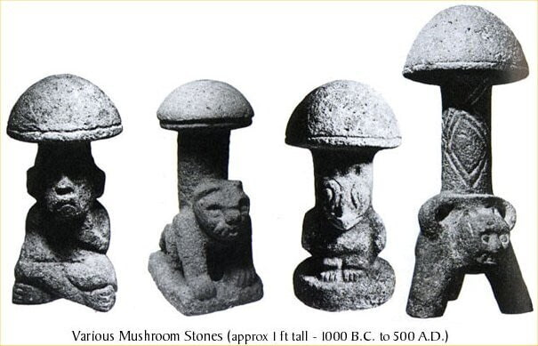 Майя и Ацтеки тоже знали толк в галлюциногенных грибах. Об этом свидетельствуют "грибные камни" в форме псилоцибиновых грибов. Этим монументам в честь магических грибов из мексиканского города Гватемала более 2500 лет.