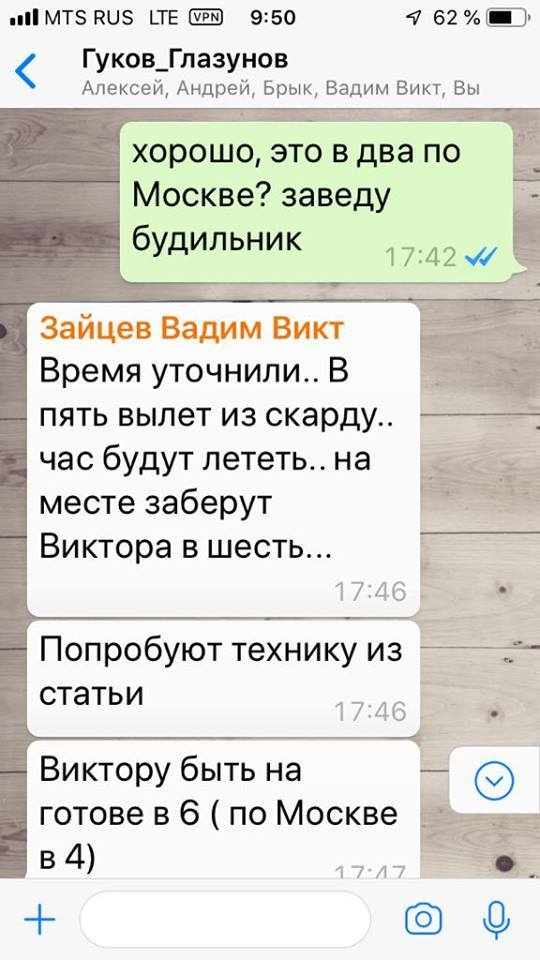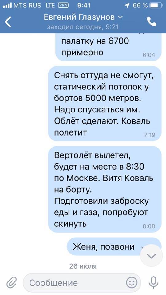 Витя: «У них [у военных] в 10 минутах есть база. Им надо туда с самого утра прилетать, а потом интересоваться погодой. Надо планировать на завтра на самое утро. Сегодня было два часа супер погоды, но пилоты поздно прилетели. И ещё я не очень верю в возможность высадки на ребро. Снять Саню тросом куда проще, а там либо стена, либо многометровые карнизы и сераки. Единственный шанс на спасение - это вертолёт».