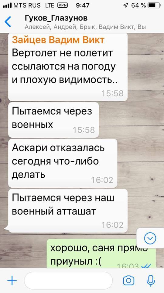- Сегодня лётчики ждут окно. Два вертака наготове. Завтра улучшение погоды. Не сдаваться. Любим и ждём. J.