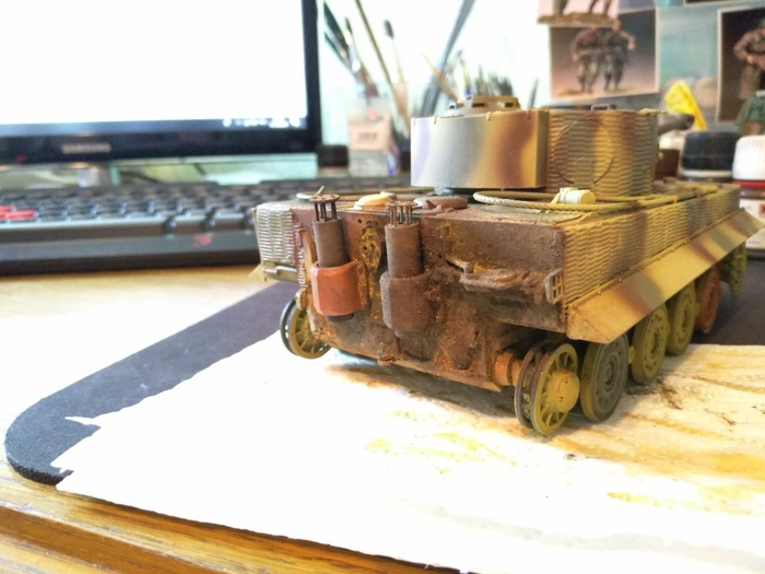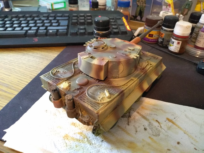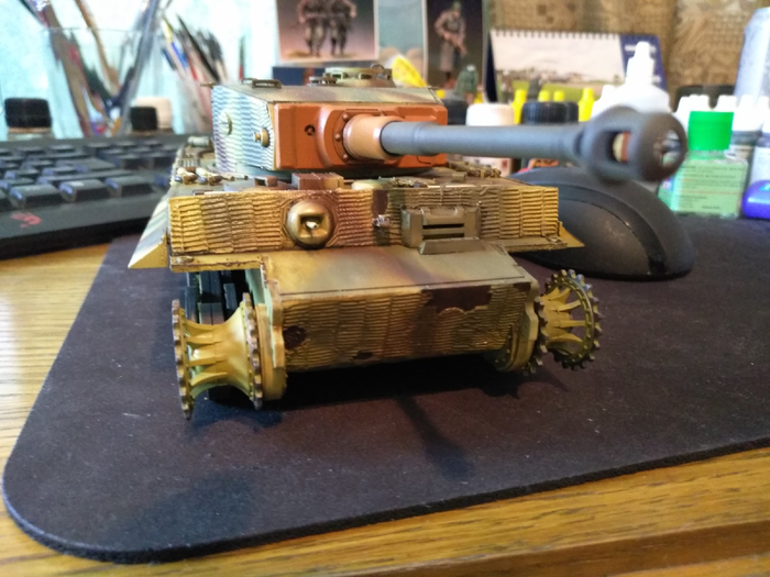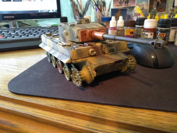 Достался мне от друга набор тамии с поздним тигром. Естественно на контрасте детализации, был призван он под ружо экспериментов. Циммерит нанес сам друг, но чуууть не доделал, не беда, подумал я, машина планируется глубоко ремонтная. Следовательно на домкрате и задней стенке сымитировал нибуёвый пожар, или же танк доолго стоял под влиянием температуры. (нужное выберите сами), маску откопали и поставили, как и ствол, потому маска в грунте, а ствол в цвете металла. Гусянки влеплю ДС от дракона или его родные, пока не решил. Глаза режут отверстия под кожухи выхлопных труб (АЖ БЕСИТ, ДРАКОН ПОМОГИ!!!)
