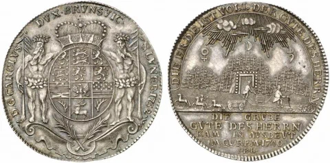 Целлерфельд. Талер, 1752. Доходности руднику Благость Господа. Так уж повелось, что герб обычно держат два Дикаря. Справа можно разглядеть горняков, выталкивающих из штольни гружёные вагонетки.