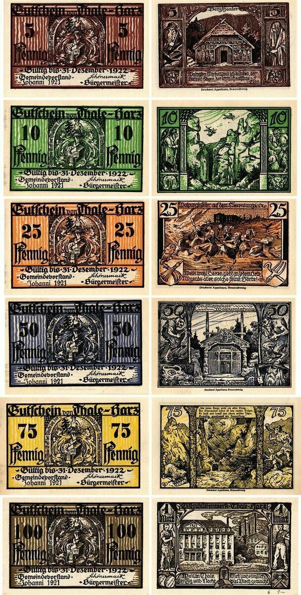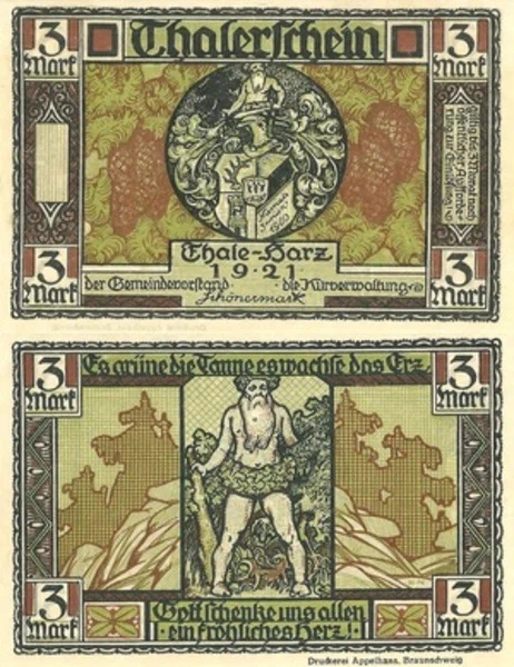 Красочная серия нотгельдов города Тале с Вильдерманом на лицевой стороне, и различными сюжетами из немецких легенд на оборотах. 1921 год. Давайте рассмотрим один из них подробнее.