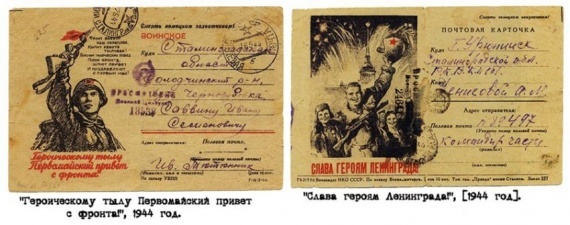 С началом Великой Отечественной войны из-за нехватки бумаги с августа 1941 года был прекращён выход 20 центральных газет и 179 журналов. Стандартным почтовым отправлением из действующей армии становится письмо-«треугольник», по особому свёрнутый обычный лист бумаги, не требующее марки. Выпуск почтовых конвертов резко сокращается и в таких условиях почтовая карточка-открытка становится незаменимой. Увы, из-за отсутствия на многих карточках официальных данных, установить их год выпуска, тираж, наименование издательства и авторство художника просто невозможно. Начиная с 43-го года оформление меняется и открытка становится двухсторонней. На лицевой стороне теперь иллюстрация, а надписи «ВОИНСКОЕ» и «Смерть немецким оккупантам!» перемещаются на обратную сторону и располагаются над адресной строкой.