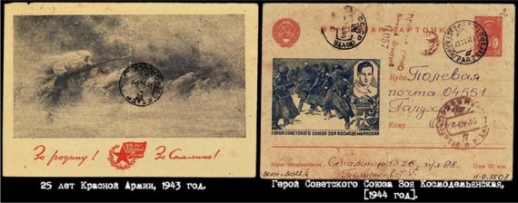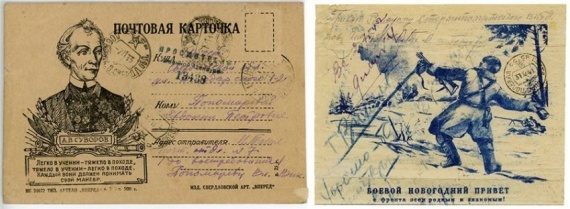 Стандартная открытка. Их издательство возобновляется только в 1943-м году, это стандартная маркированная почтовая карточка с иллюстрацией, первой серией выходят открытки, посвящённые 25-летию Красной Армии, чуть позже выходит серия «Герои Советского Союза».