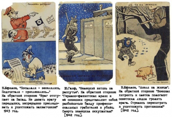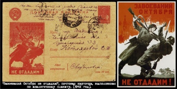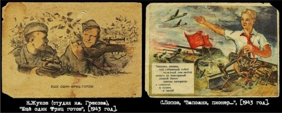 Открытки создавались по лучшим военным плакатам того времени. Известны серии открыток по плакатам «Боевого карандаша» и «Окна ТАСС».