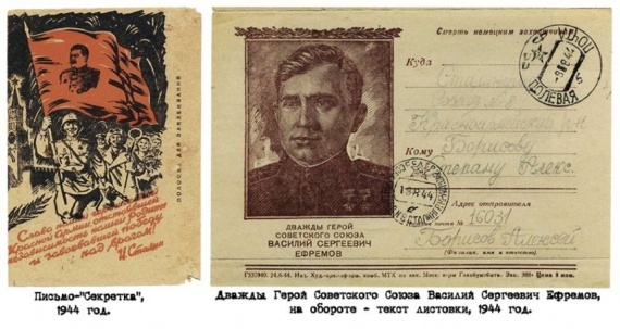 «Воинское письмо». Такая почтовая карточка предназначалась для отправки из воинских частей в тыл. С 41-го года — это, как правило, односторонняя открытка, напечатанная в один или два цвета, на плотной неотбеленной бумаге, марка отсутствует. На лицевой стороне надписи «ВОИНСКОЕ» и лозунг «Смерть немецким оккупантам!» В графе «Адрес отправителя» присутствует строка «Полевая почта».