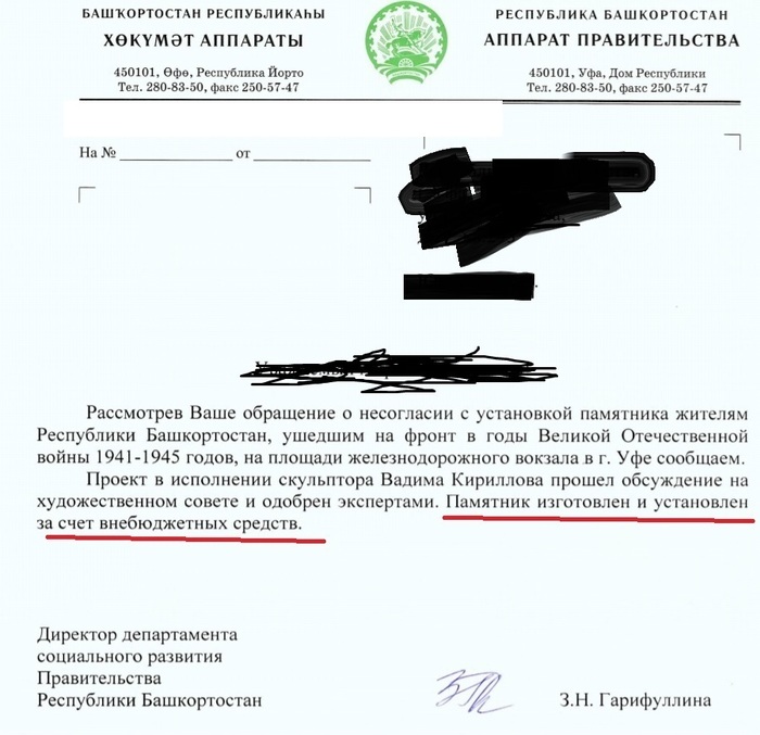 Когда чиновникам нечего ответить они отвечают просто - СДЕЛАЛИ ЗА СЧЕТ ВНЕБЮДЖЕТА. Однако изначально ни госСМИ ничего не пишут что глава региона приехал на открытие паятника сднланного за счет внебюджетных средств на средства от анонимной компании (которая засчитала это как средства на благотоврительность и получила ООГРОМНЫЙ налоговый вычет)...