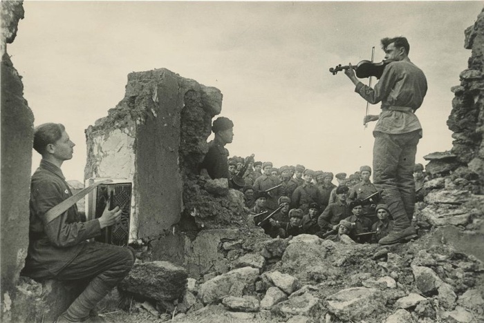 «13 марта 1943 года наша 33-я гвардейская дивизия штурмом взяла Новошахтинск. Город лежал в развалинах. В бою особо отличились разведчики. Для них мы с Григорием Вакуленко, баянистом, которого вы видите на снимке, и играли. Было очень холодно, сводило пальцы, смычок поначалу не слушался, мешала шинель, и я ее скинул. Я видел, как светлели лица бойцов, как на миг забывались кровавые атаки. Я понимал, что нужен этим людям, которых не пощадила война. Они слушали меня и признавались потом, что вспоминали родной дом, матерей, жен, невест. Музыка несла им радость. Как они слушали! Никогда не было у меня такой благодарной аудитории.