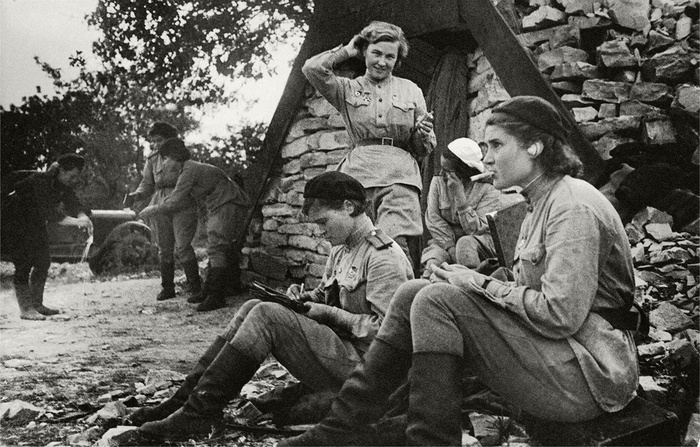 15. Летчицы 46-го гвардейского ночного бомбардировочного авиационного полка у фронтовой землянки