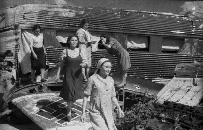 19. Временное жилище в разбитых самолетах в разрушенном городе