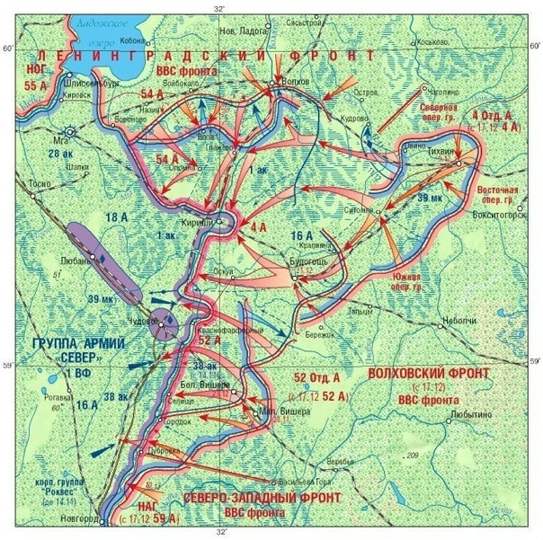 Здравствуйте Уважаемые читатели! 8 сентября 1941 года немцы вышли к Ладожскому озеру и блокировали Ленинград по суше, но это еще не было катастрофой, самым страшным стало то, что противник продолжил наступление и перехватил в начале ноября дорогу, идущую к Ладожскому озеру через Тихвин, которая была незаменимым звеном в обустройстве Дороги Жизни. И с этого момента положение в городе стало стремительно ухудшаться, а тут еще и финны, наступающие по восточному берегу озера и имеющие возможность ударить в тыл. Поэтому Ставка принимает своевременное решение на проведение Тихвинской наступательной операции. Соотношение сил составляло 180 тысяч у нас и 140 у врага, при этом наши войска охватывали противника и это давало определенный шанс на успех. Наступать предстояло 52-й, 54-й, 4-й армиям.