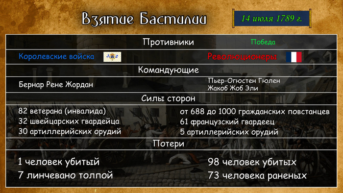Днем начала революции считается штурм Бастилии — главной политической тюрьмы, после чего по всей Франции началась волна расправ и самосудов. Современники называли происходящее эпохой «Великого страха» — государством два месяца никто не управлял, а на всей территории происходили беспорядочные погромы и казни. В столице некоторое время действовало два центра: Версаль, где по-прежнему пил и гулял Людовик, и Учредительное собрание, которое пыталось отстранить от власти короля. Что закончилось принятием конституции по типу той, что была разработана в США четырьмя годами ранее. По конституции, Франция, правда, осталась монархией, но соседи увидели в этом угрозу и начали готовить военную интервенцию.