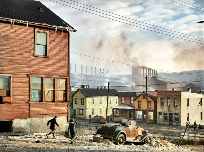 Дома рабочих возле Питтсбургской тигельной стальной компании в Мидленде, штат Пенсильвания, 1941 год.
