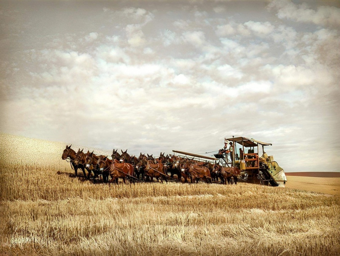 Комбайн, запряженный двадцатью мулами. Округ Уолла-Уолла, 1941 год.