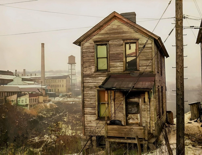 Один из домов в негритянском квартале Рочестера, штат Пенсильвания. Заброшенные стекольные заводы на заднем плане. Январь 1941 года.