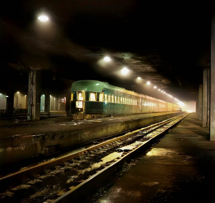 Поезд железной дороги Балтимор и Огайо вот-вот отправится с Юнион-Стейшн по Олтон-роуд в Сент-Луис. Чикаго, 1943 год.