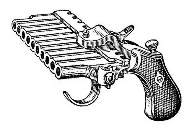 Впрочем, оружейники не могли остановиться на пеппербоксах и револьверах. Каждый хотел выделиться и произвести нечто новое и еще более смертоносное. Так в разное время появлялись пистолеты, которые нельзя было отнести ни к какой из категорий вообще.