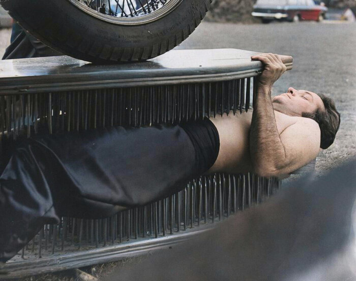 Каскадер Джеки Пол лежит между досками с гвоздями, когда на него опускают колесо 2,5-тонного автомобиля.