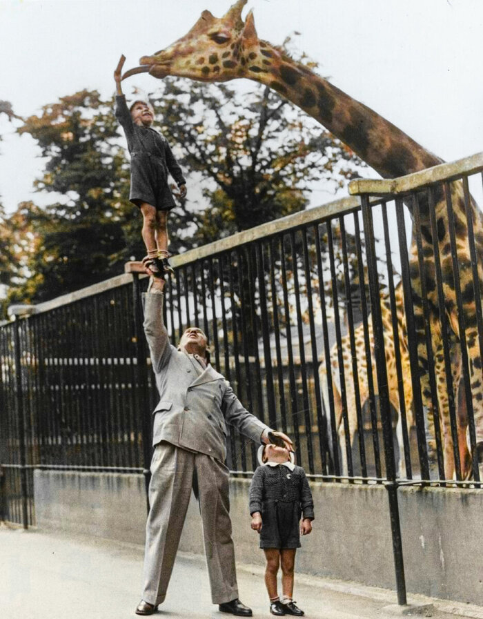 Мужчина вместе со своими сыновьями придумал изощренный способ кормления жирафа. Снимок сделан в зоопарке Лондона в 1950-м году.