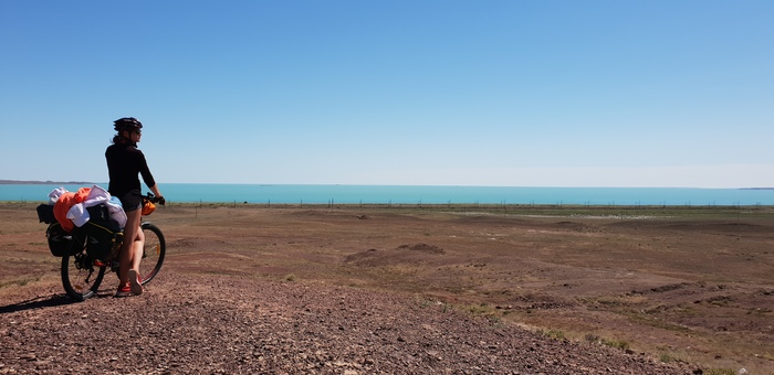 Пейзаж достаточно скудный, вокруг высохшая земля покрытая солончаком, за исключением одного места, где дорога сближается с оз. Балхаш, свернули с дороги поглазеть на озеро и запечатлеться на его фоне.