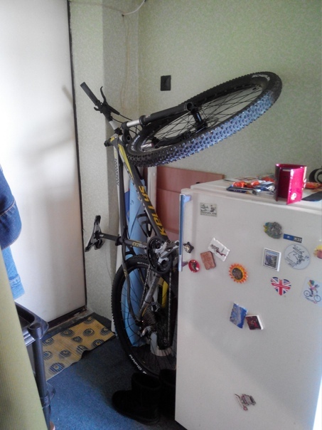 А тем, кому негде хранить велосипед в квартире - слайды. Моя квартира общей площадью 20 м, балкона нет. Два варианта хранения в коридоре: