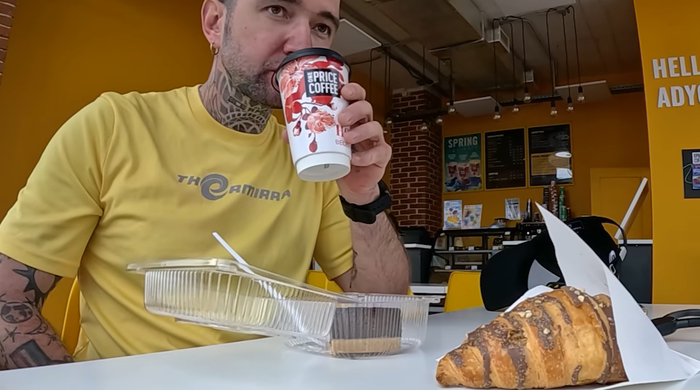 Время близится к обеду, пора искать место, в котором я смогу пополнить запасы энергии. Я замечаю столовую, которая на деле оказалась маленькой кафешкой, и заказываю себе кофе с пирожными. Конечно, полноценным приемом пищи это не назовешь, но проехать оставшиеся до Краснодара километры на этом можно.
