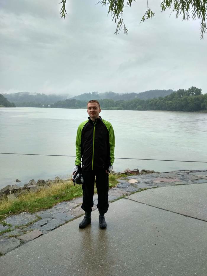 Обратите внимание на реку за моей спиной. Здесь Дунай (слева, темнее) сливается с Инном (светлее) и еще долго видна граница между ними.