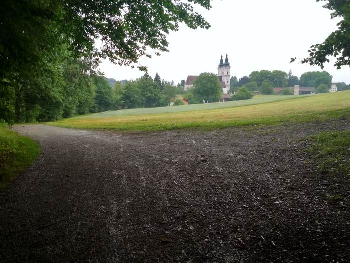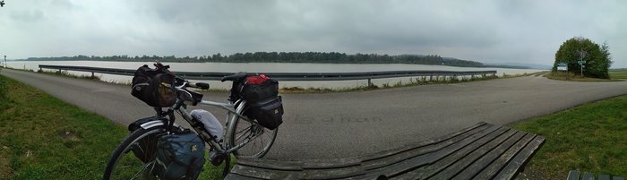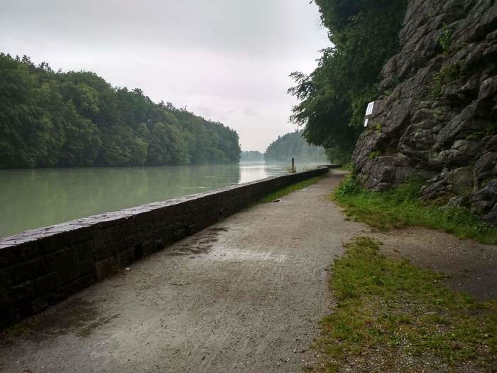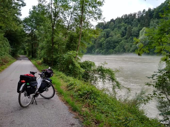 Река на равнине не теряла своего горного характера, с берега было видно как быстро течет Инн. Погода понемногу начала улучшаться (дождь шел всё равно, но не так сильно, да и я ехал в лесу под деревьями). Первый день запомнился мне туманами над рекой, свежим воздухом в лесу и общей умиротворенностью под аккомпанемент шелеста шин по мокрому гравию.