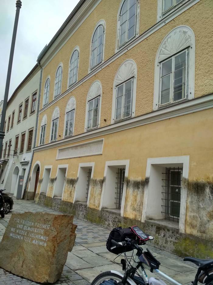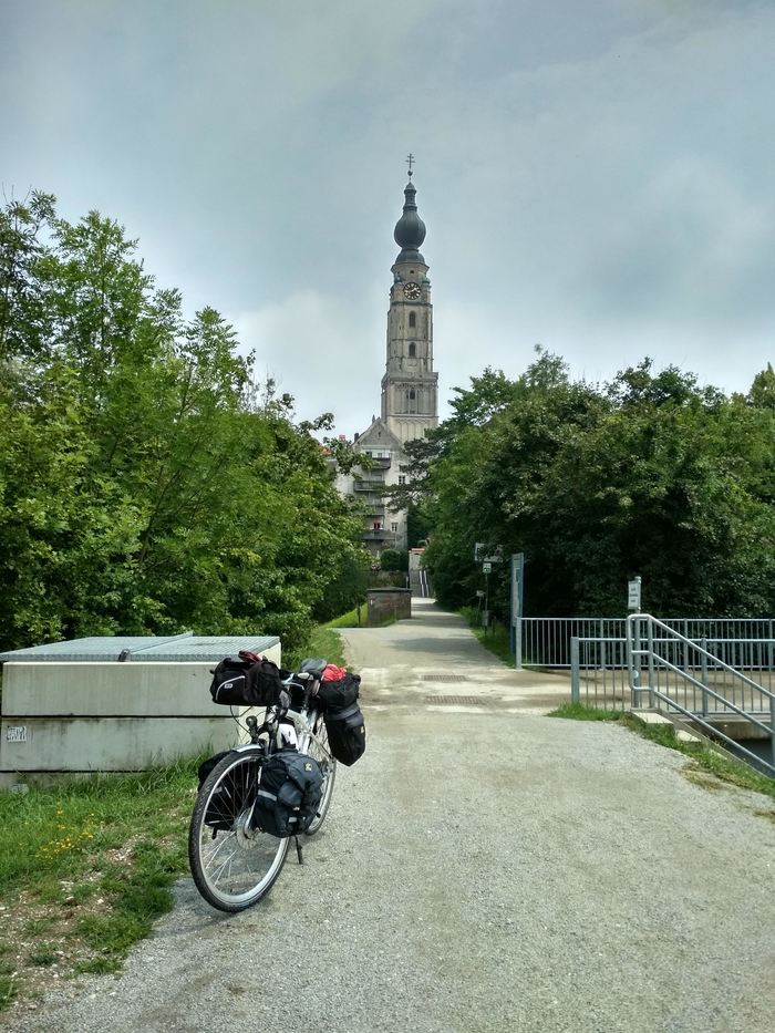 После выезда из города я начал ехать по немецкой трассе R6 вдоль реки Инн, Römer-Radweg (Римская велотрасса). Она начинается в Альпах у перевала Малоя (Malojapass), проходит через Швейцарию, Австрию и Германию и заканчивается в Пассау. Я увидел самый конец этой велотрассы, поставив себе галочку "Проехать по Römer-Radweg". Река здесь служит естественной границей двух государств - Германии и Австрии.