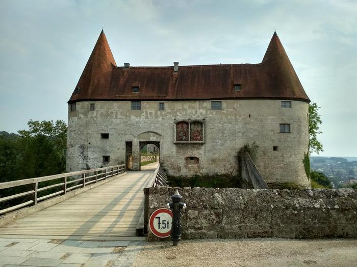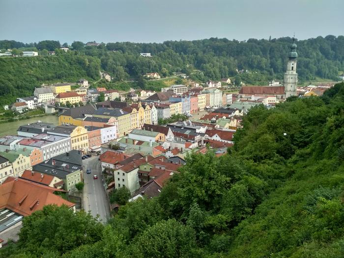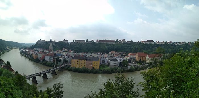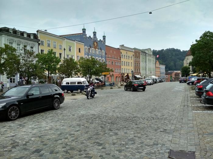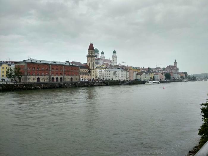 Перед самым Пассау меня догнал новый фронт и в город я въехал под нарастающий стук капель по шлему и стеклам очков. При попытке надеть дождевик я его порвал в районе шеи, поэтому пришлось ехать в куртке и дальше. Пассау встретил меня свицново-серым небом, перекрытым движением на мосту Принцрегента Луитпольда и бешеными ценами на горячий чай (€5 за маленькую чашечку!).