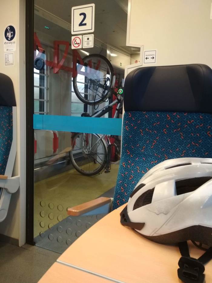 Вот так вот перевозятся велосипеды в поезде Чешских Железных Дорог (České dráhy). Место, откуда сделана фотография - специально для пассажиров с велосипедом.