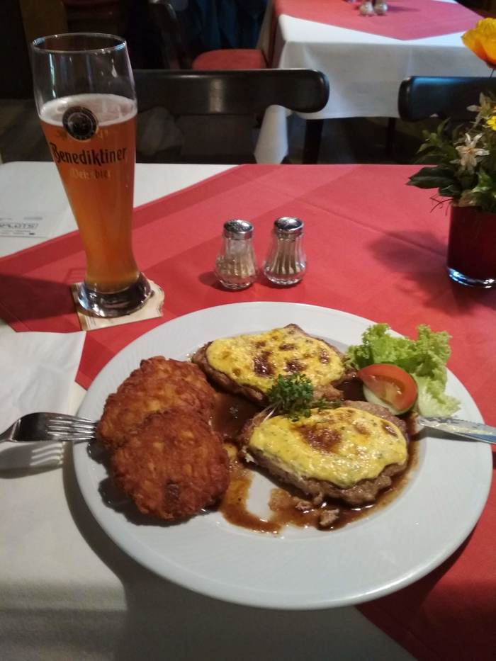 Порции в нетуристической Германии - гигантские, цены - приемлемые, а пиво - отличное. В бокале - пшеничное пиво, на тарелке свиные отбивные под сырным соусом с местными драниками.
