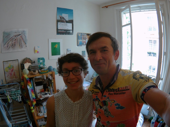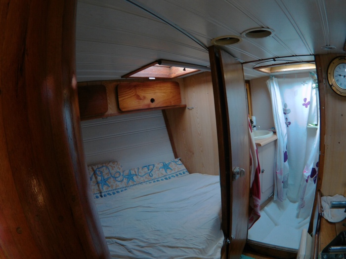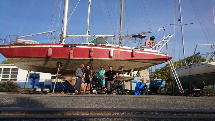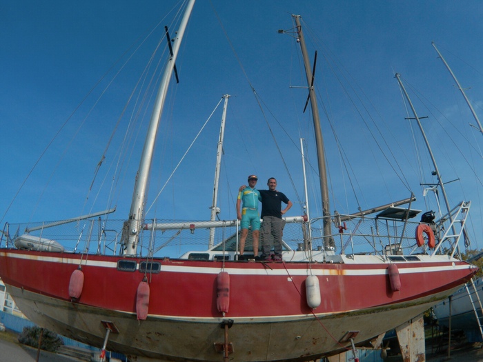 34. Большая старая яхта 1978 года, полностью оборудованная под жилье, но и на ходу при этом! Хозяин велосипедист по имени Жиром, собирается через неделю плыть в Ля-Рошель ловить рыбу. Переложив все паруса из своей каюты в проход, я отлично выспался . Жиром с утра привез горячих круассанов, помыл мой велик очищающей жидкостью и смазал, а еще приделал морскими узлами веревки, шобы не падали мои полуторалитровые бутылки с водой! У него жена американка, спортсменка стреляет из лука, а он делает титановые крылья для легких самолетов.