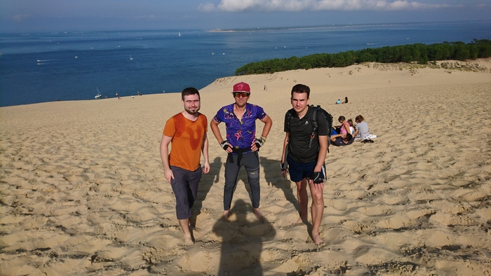Потом полезли на полукилометровые пески, где уже ползали полтыщи туристов. Костя потерял ключ от велозамка, которым были пристегнуты их велики и мы начали перекапывать эту песочницу, но не нашли. Пришлось прокату великов ехать сюда, штраф составил 50евро. А друзья на поезде успели в Бордо на самолет.