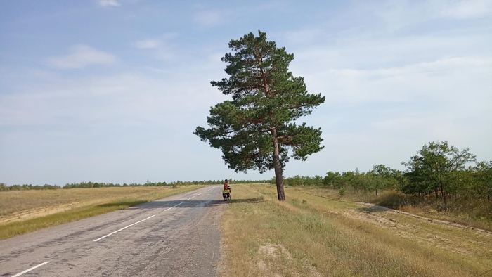 Выдвигаемся из квартиры в 13 часов, самое адово пекло. Чтобы нам было ещё веселее, сегодня задул сильный южный ветер, который мало того что встречный, так и несёт раскалённый воздух непонятно из каких пустынных широт. Едем медленно и печально, останавливаясь под редкой тенью чуть перевести дух и остыть. Много мы сегодня не накатаем, это точно. Двигаться вперёд позволяет отсутствие значительного рельефа и то, что мы свежие и отдохнувшие.