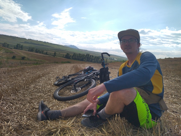 Когда остановились в поле на попить и перевести дух, я завалился на свежее скошенное сено и прям всё.. Давно я не испытывал такого кайфа от запаха свежей травы и сена. Прям детство в деревне вспомнил))) Ещё ветерочек обдувает, солнышко греет. Благодать прям))