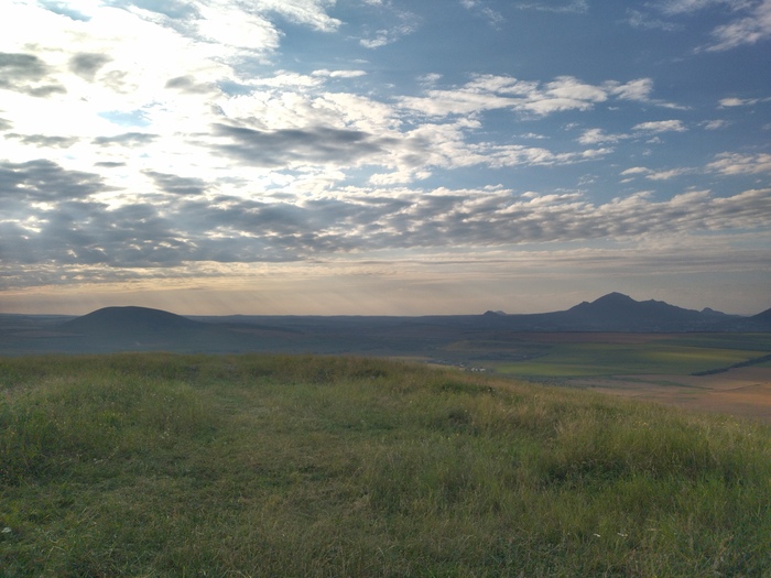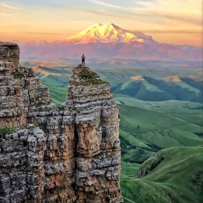 41 день я ехал на велосипеде от Санкт-Петербурга до Пятигорска и здесь я впервые увидел цель. Эльбрус красавец в белой папахе. Повезло с хорошей погодой и ясным небом, смог увидеть этот самый большой стратовулкан в России на расстоянии более 100 км. Какой же он огромный, его вершины притягивают меня.
