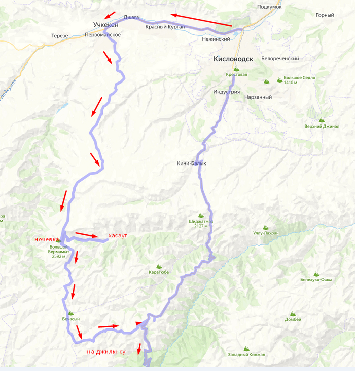 Старт Кисловодск далее строил маршрут по тепловой карте Стравы до Бермамыта(единственное думаю метнуться за водой в Хасаут, вроде бы по картам отмечен источник, а может там магазинчики есть?) , в общем в планах ночевать на Бермамыте, а делее по тепловой той же карте вниз на Бечасын, тут возникают вопросы, стоит ли внизу ехать и на дорогу Джилы-Су выходить или лучше это сделать через тот же Хасаут? Ну далее выезжаю на асфальт и гоним на джилы-Су