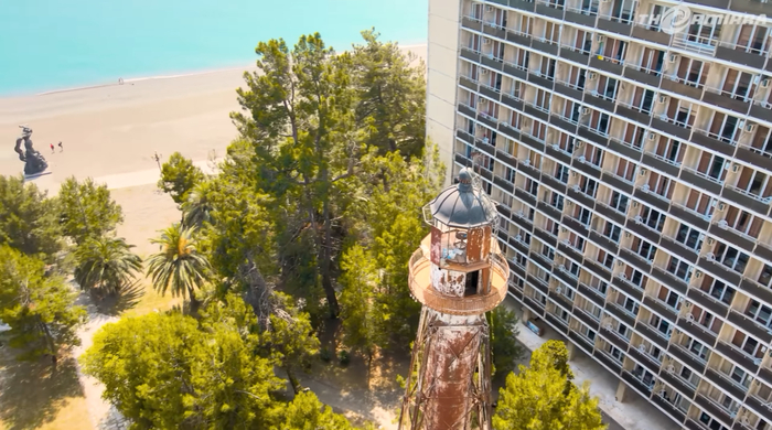 Контрасты в Абхазии невероятные. Маяк стоит ровно по середине двора жилого дома, и очевидно, что дом был построен уже после того, как маяк перестал работать. Я думаю, что никто не согласился бы жить в квартире, которую каждые 10 секунд полностью освещает огромный прожектор.