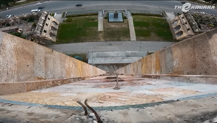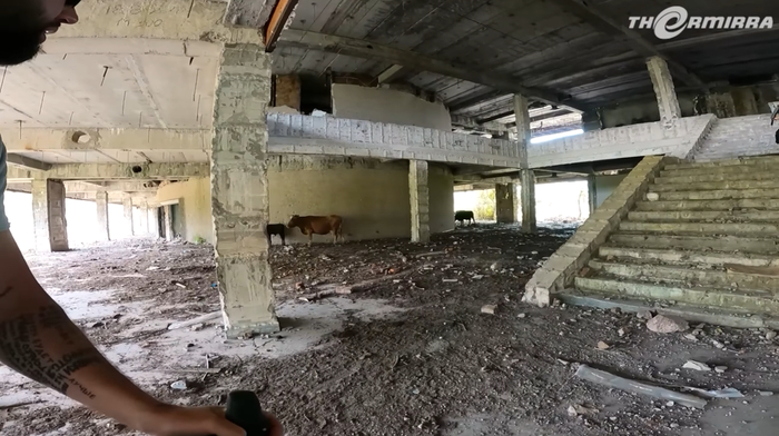 Теперь база выполняет функцию убежища для нескольких милых коров. Их мы встретили, зайдя внутрь одного из строений. Все стены и лестницы отмечены массой следов от снарядов и пуль различного калибра. Зрелище, конечно, жуткое, учтя то, что с крыши главного здания видны пляжи, жилые дома и улочки по котором уже ходят люди.