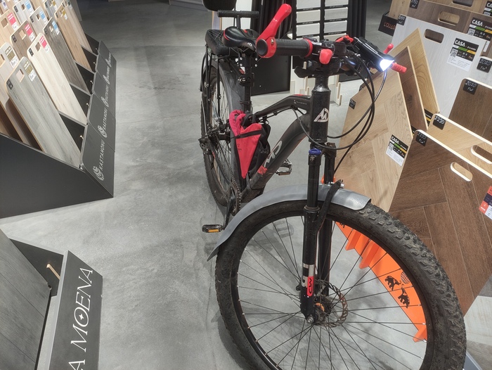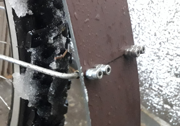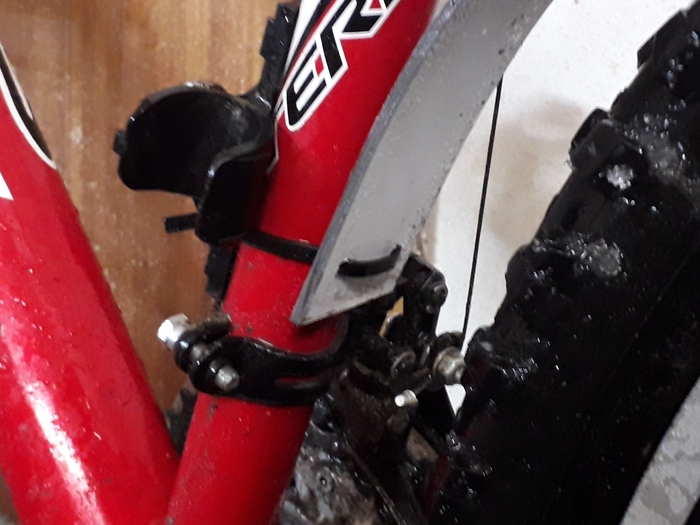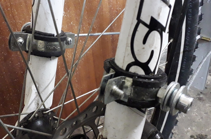 Спереди интереснее) На вилках дорожных велов есть монтажные уши под усы крыльев, горным повезло меньше. Поэтому как-то так..под хомутами резинка, тоже в хозмагах есть.