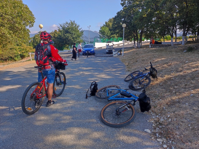 Накрутили сегодня 32 километра. Пятая точка побаливает с непривычки. Пообедали, упаковали велики в машину. Идем пешком к КПП с Абхазией. Посмотреть что почем, да и купить чего нибудь, фрукты закончились.