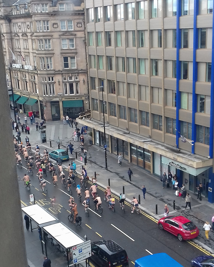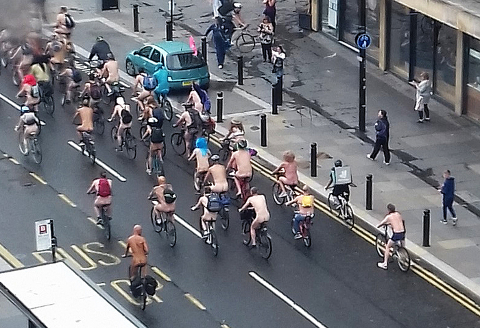 Доставщик пиццы (справа у обочины) случайно попал в поток и теперь не знает куда метнуться, чтобы не решили, что он с ними.
