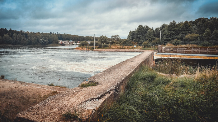 Именно эту речку мне нужно перейти и попасть на тот берег. Есть нормальный мост, но к нему нужно ехать аж в само Конаково. Так я никуда не успею, поэтому на картах я увидел пешеходный мостик, и попробую перейти канал по нему. Еду по тропинке вдоль канала.
