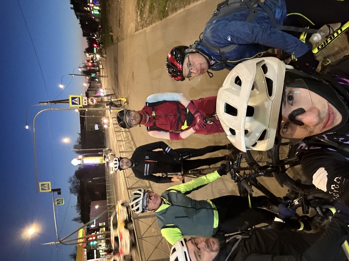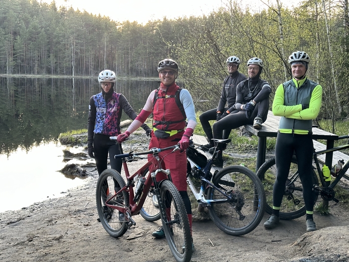 Приехали на озеро, уже солнце ушло в закат. На обратном пути температура упала до -4.6°, и благополучно задубело масло в вилке, сделав отскок очень затоможенным :) Один из хороших склонов проехал тоже с кайфом, совсем с другими ощущениями, после хардтейла. И черт возьми, дроппер это просто золото! Съезжалки становятся в 2 раза легче. Когда заехали в суоранду, стало совсем темно. На трехсекционном спуске Димас грохнулся, не увидев кочку :) А Юра, Сережа, Роман и Я решили съехать второй круг, на котором теперь я грохнулся!😂 на трехсекционном спуске, у меня что? Снова не выстегнулась чертова педаль :)