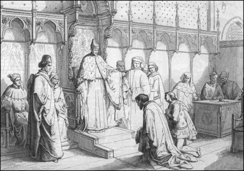 Новелло да Каррара с двумя пленными сыновьями добивается аудиенции у дожа, и вместе с сыновьями стоит на коленях, моля о пощаде. Уже в третий раз за свою жизнь — первый он делал это 30 лет назад, во время Войны в Кьодже, потом в благодарность, когда его выкрали из темницы Висконти, и наконец сейчас, прося о милосердии.
