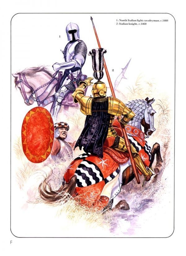 Вы же знаете мою недоверчивость к комплектации войск и обмундирования? Вот и сейчас мне кажется, что художник изрядно польстил одоспешенности своих соотечественников. Через полвека, очевидец битвы при Монлери, будет ядовито замечать, что даже у богатых шевалье нет нагрудника, или даже шлема. С другой стороны, это будет рыцарское ополчение, а на службе Венеции были профессионалы. Логично и прикупить инструментов и защиту, если у тебя работа такая. Мне нравится вот эта фигурка венецианского ополченца и она как раз на начало XV века: