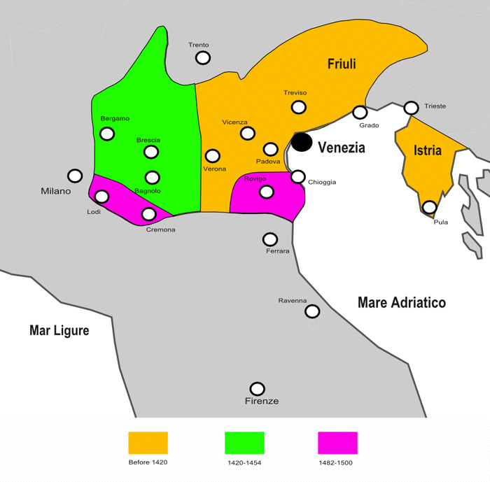 Абсолютно необходимым условием для безопасности Венеции была терраферма. Или, на венецианском диалекте итальянского, domini de teraferma — владения на материке.