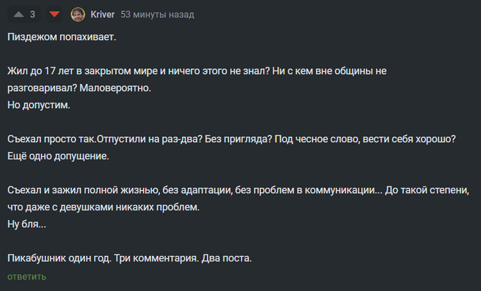 Человек из комментария сидит на Пикабу 9 лет и думает, что ему только за это должны доверять. Ты ничем не лучше этого паренька из поста. Ты такой человек. И твои слова могут быть таким же пиздежом.