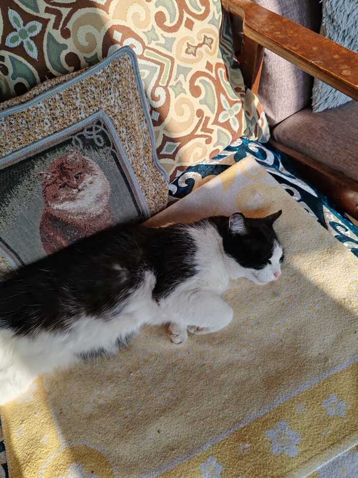 Таким своим интересом к стройке он просто влюбил в себя незнакомых людей, и по завершению работ они меня стали упрашивать забрать его с собой, на что, естественно, получили отказ. За хорошую работу, кроме, естественно, оплаты, я решил накормить ребят- приготовил чай, бутерброды и нарезал свежие огурцы с помидорами. Ну как тут можно было обойтись без черно-белого тех. надзора? Макрон, учуяв запах колбасы, был на месте, терся об ногу водителя и сразу получил вознаграждение. В свою очередь, перед самым отъездом ребят, он успел поймать мышь и принести ее к их машине, как бы в знак благодарности. А веранда получилась у нас очень уютной и светлой- любимое место сбора гостей в теплое время года, ну и, конечно, Макрон не остался в стороне- здесь его опочивальня и пункт наблюдения, ведь он тоже помогал строить, заслужил, однако.